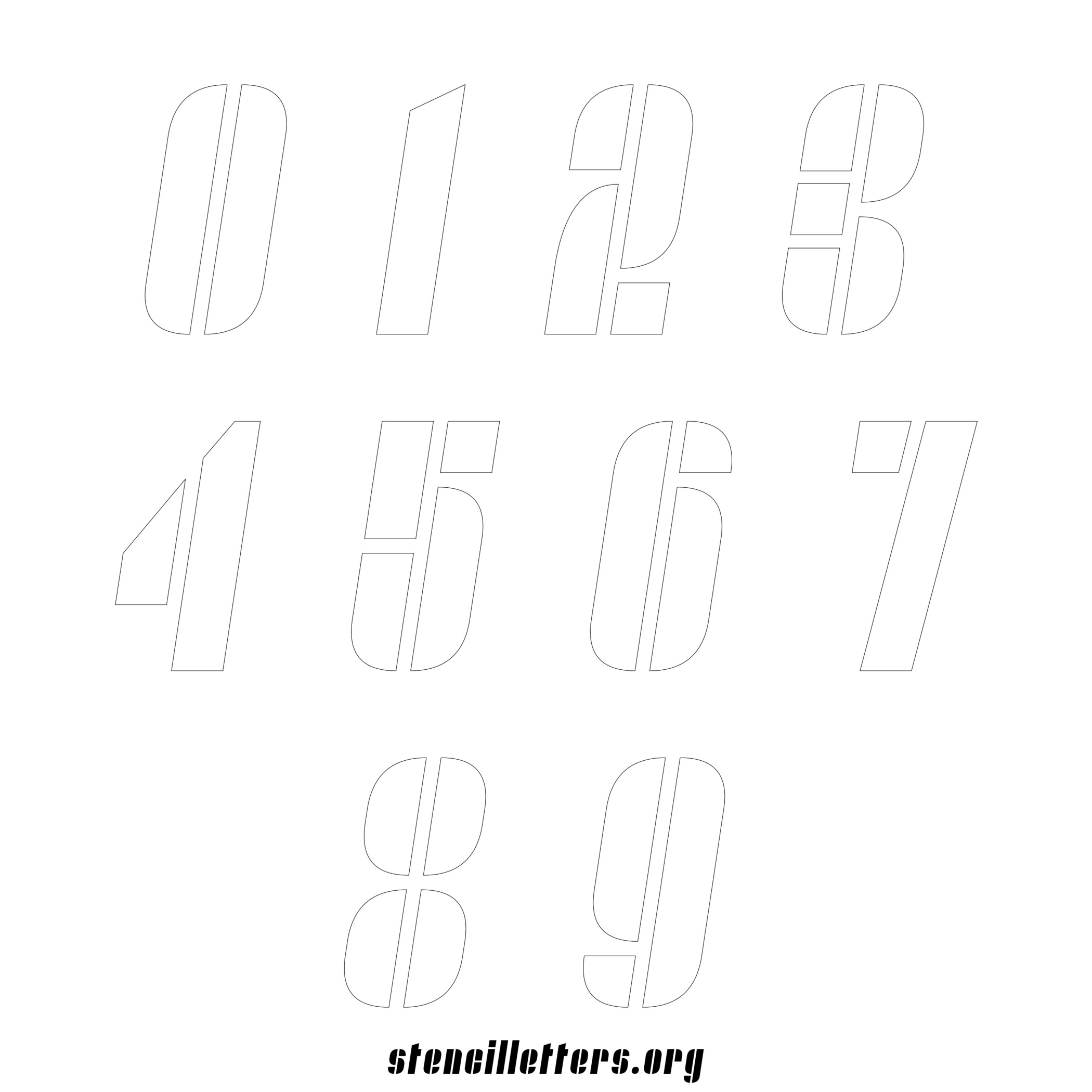 Stencil Design 257 Slanted. Print these free numbers stencils and make your own DIY templates for your stenciling projects. Available in high resolution printable sizes: 4 Inch, 5 Inch, 6 Inch, 7 Inch, 8 Inch, 9 Inch and 10 Inch.